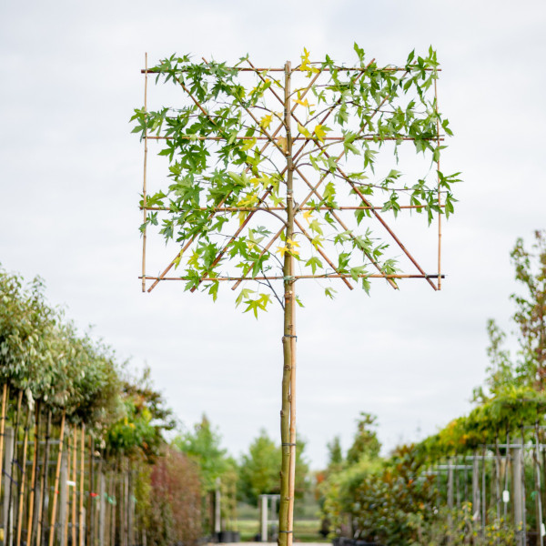 Der Amberbaum Spalier wächst kompakt. Der Amberbaum Spalier ist die feinste Sorte und ein richtiger Hingucker. Der Amberbaum Spalier hat handförmige, spitze Blätter. Der Amberbaum wird mit einem Gestell geliefert, das 150 x 120 cm ist. Bei uns finden Sie verschiedene Abmessungen; für jeden Garten gibt es ein geeignetes Format. Unser beliebtester Amberbaum Spalier hat eine Abmessung von 8-10cm. Möchten Sie diesen hervorragenden Baum mit wunderschönen farbenfrohen Blätterntäglich in Ihrem Vordergarten oder Garten hinter dem Haus bewundern? Wählen Sie sich dann online den passenden Baum aus oder besuchen Sie unsere Baumschule in Lienden!