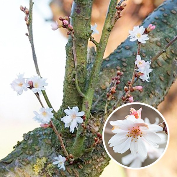 Der Prunus subhirtella Autumnalis ist eine beliebte, japanische Zierkirsche, die im Winter blüht. Deswegen wird der Blütenbaum auch Winterkirsche genannt. Von November bis März können Sie mit dieser Zierkirsche von phantastisch schönen, weißen (bis hellrosa) Blüten genießen. Bei Frost wird der Baum zeitweise nicht blühen. Bei Frost können Sie aber ruhig einige Äste abschneiden und in eine Vase stellen. Somit werden die Blüten zuhause weiterwachsen! Und keine Angst: sobald der Frost vorbei ist, wird der Baum wieder schöne Blüten haben. Nach der Blüte werden kleine, schwarze Beeren an den Ästen wachsen. Diese kleine Früchte haben eine anziehende Wirkung auf Vögel und somit genießen Sie im Sommer von einem lebendigen Garten. Die Blätter, die im Frühling erscheinen, haben eine bronzene Farbe. Im Sommer färben die Blätter sich grün. In diesem Zeitabschnitt bildet der Baum einen grünen Sonnenschirm, der einen angenehmen Schatten bietet ohne das Sonnenlicht komplett zu wehren.